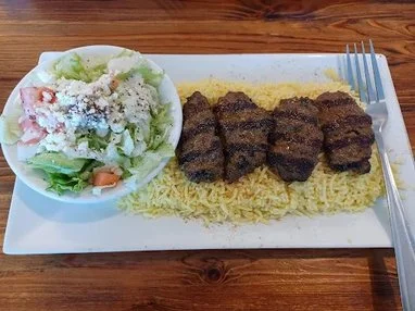 Marinated lamb kebabs grilled to perfection, served over saffron rice and a small greek salad.